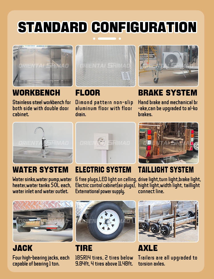 Untuk bahan utama, kami memilih keluli tahan karat 304 berkualiti tinggi, yang terkenal dengan ketahanan kakisan yang sangat baik dan ketahanan yang sangat baik, dan dapat mengekalkan prestasi yang stabil dalam pelbagai keadaan alam sekitar, memastikan treler makanan kami dengan produk dapur penuh dapat mengekalkan kualiti dan fungsi mereka yang sangat baik walaupun dalam jangka panjang dan menghadapi pelbagai cabaran. 304 Rintangan Stainless Steel yang sangat baik terhadap kakisan, supaya trak itu tidak mudah dipengaruhi oleh pengoksidaan atau karat, yang sangat memanjangkan hayat perkhidmatannya. Rintangan kakisan yang sangat baik dari 304 keluli tahan karat menjadikan trak kurang terdedah kepada pengoksidaan atau karat, sangat memanjangkan hayat perkhidmatan mereka.
