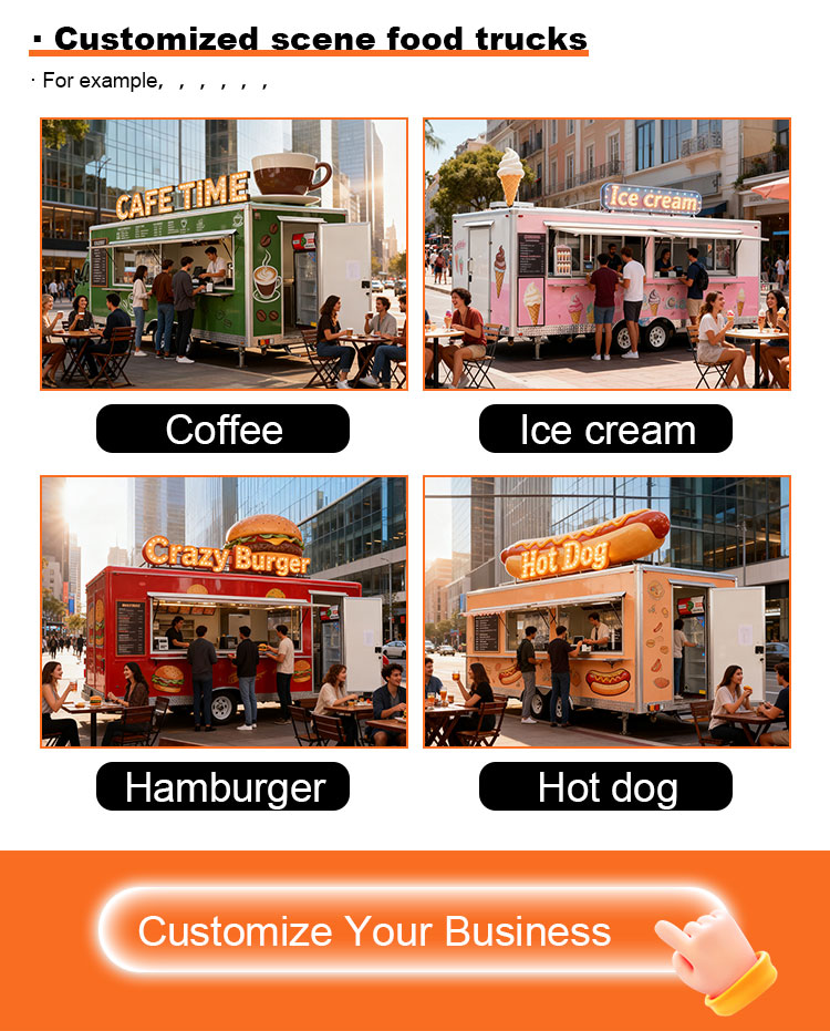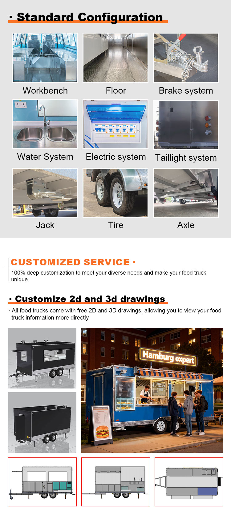 Pemodelan dan gaya: pemodelan penampilan dan gaya trak makanan adalah faktor penting untuk menarik pelanggan. Ia boleh disesuaikan mengikut imej jenama pelanggan, ciri perniagaan atau pilihan peribadi, seperti reka bentuk yang diperkemas, gaya retro, kesederhanaan moden dan sebagainya.