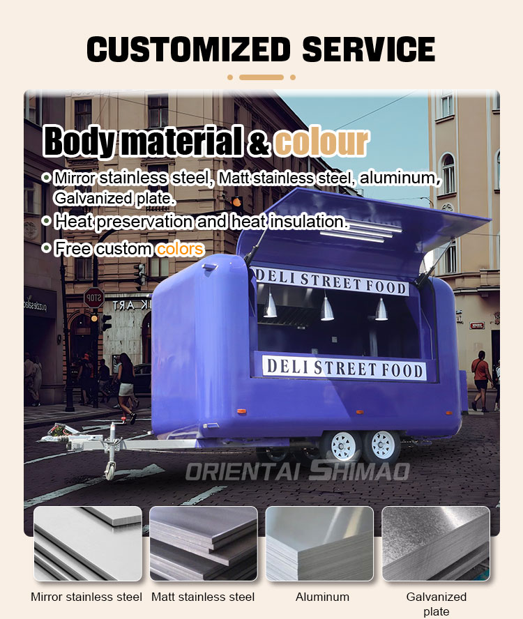 Trailer Van Food mengamalkan keluli tahan karat sebagai bahan utama, yang dicirikan oleh rintangan kakisan, kekuatan tinggi, mudah dibersihkan, cantik dan tahan lama. Permukaannya membentuk lapisan kromium oksida yang padat, dengan berkesan menghalang kakisan logam dan memastikan keselamatan makanan dan kebersihan. Keluli tahan karat mempunyai penampilan yang cerah, kuat dan tahan lama, mudah dibersihkan dan dikekalkan, dengan rasa moden, selaras dengan keperluan kesihatan alam sekitar. Oleh itu, treler makanan besar yang lengkap bahan adalah sangat baik, sesuai untuk pemprosesan makanan dan persekitaran jualan, untuk memenuhi permintaan pelanggan untuk kualiti produk dan piawaian kesihatan.