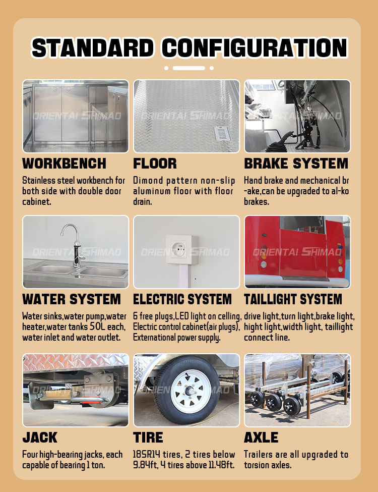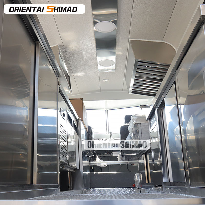 Susun atur dalaman: Susun atur dalaman treler telah direka dengan teliti dan boleh diselaraskan secara fleksibel mengikut keperluan perniagaan yang berbeza. Kedua -dua penempatan peralatan dapur dan reka bentuk jadual operasi mengambil kira kemudahan dan kecekapan pengguna.