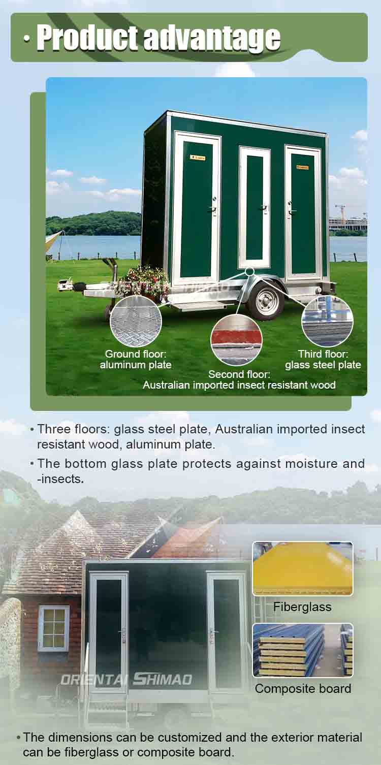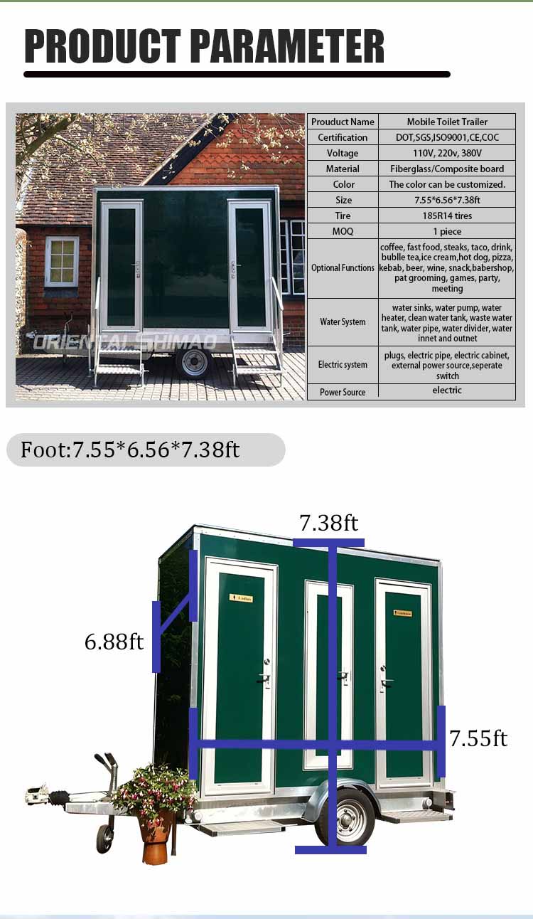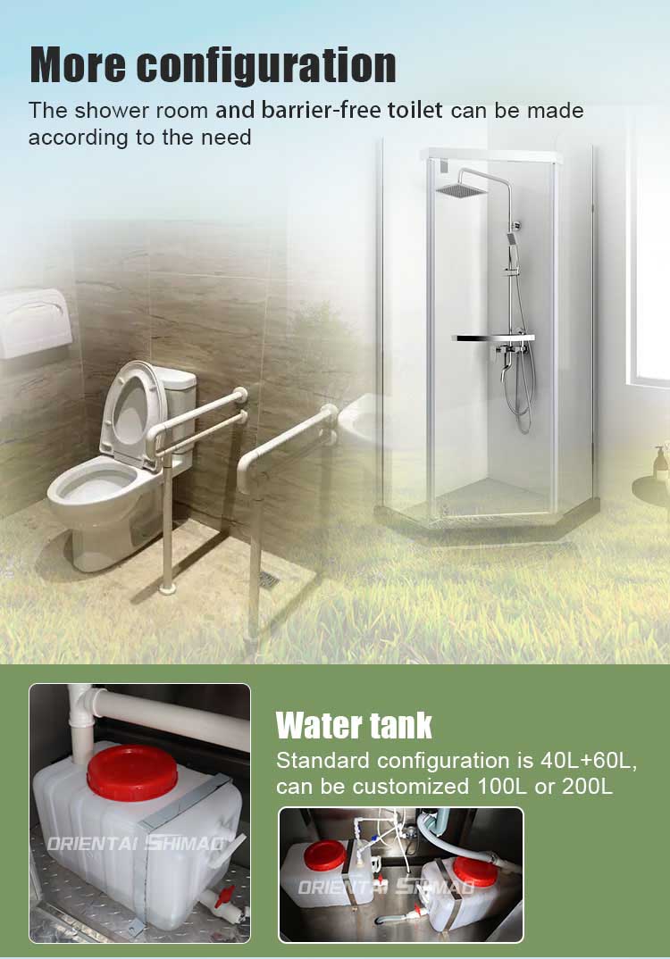 Oriental Shimao Mobile Toilet House adalah penyelesaian sanitasi yang optimum untuk pelbagai tapak luaran, keperluan kemudahan sementara dan situasi kecemasan. Dengan reka bentuk moden dan set ciri yang sangat baik, ia bukan sahaja menyediakan pengguna dengan pengalaman tandas yang selesa, tetapi juga meningkatkan standard kebersihan seluruh tempat. Sama ada acara besar, tapak pembinaan atau tindak balas kecemasan, trak tandas mudah alih ini memastikan persekitaran yang bersih dan mudah.