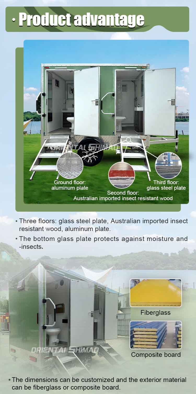 Oriental Shimao Deluxe Treler Tandas Luar Mesra Eco adalah penyelesaian tandas mudah alih yang direka untuk memenuhi keperluan mewah untuk semua jenis acara berskala besar, tapak pembinaan, kem luaran dan tapak penyelamatan kecemasan. Menggabungkan teknologi alam sekitar yang maju dengan reka bentuk mesra pengguna, kenderaan sanitasi ini menyediakan pengalaman tandas yang selesa, selamat dan cekap, menjadikannya pilihan terbaik untuk kemudahan sanitasi sementara moden.