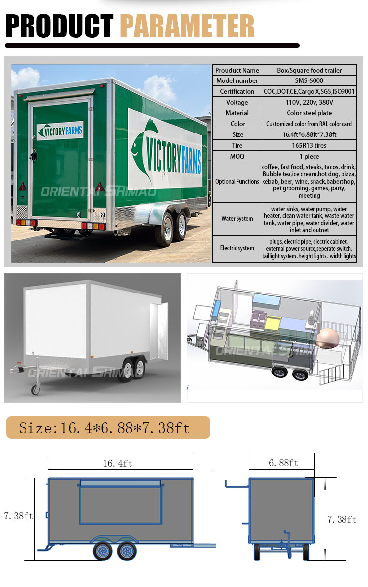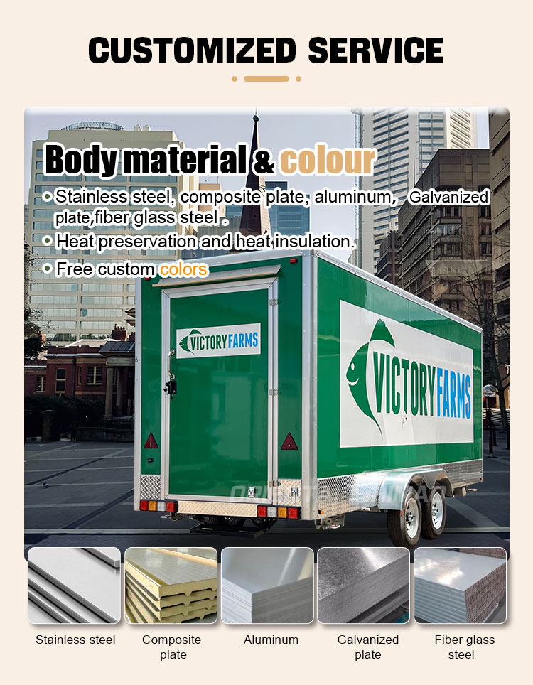 Penyesuaian Bahan: Pilihan bahan secara langsung berkaitan dengan ketahanan, estetika dan keselamatan trak makanan. Kami menawarkan pelbagai bahan badan, dari aloi aluminium yang tahan lama hingga serat karbon ringan, dari keluli tahan karat klasik hingga bahan komposit penjimatan tenaga, masing-masing dengan kelebihan tersendiri dan senario aplikasi. Sementara itu, kami juga memberi perhatian kepada butiran, sama ada bahan roda, kekukuhan kerangka daya tarikan atau kemudahan bicu, kami akan menyesuaikannya mengikut keperluan sebenar anda untuk memastikan bahawa setiap bahagian trak makanan dapat mencapai prestasi yang optimum.