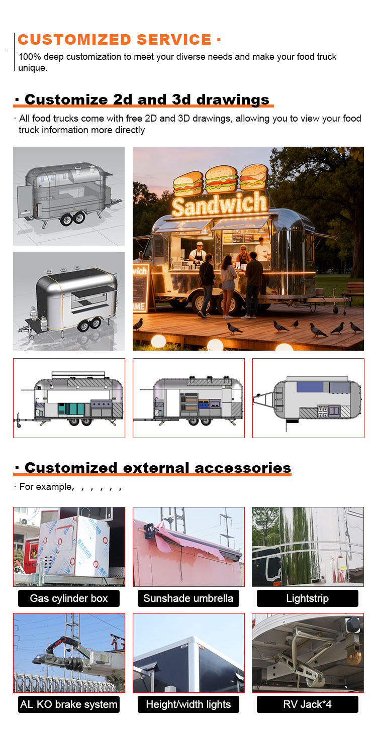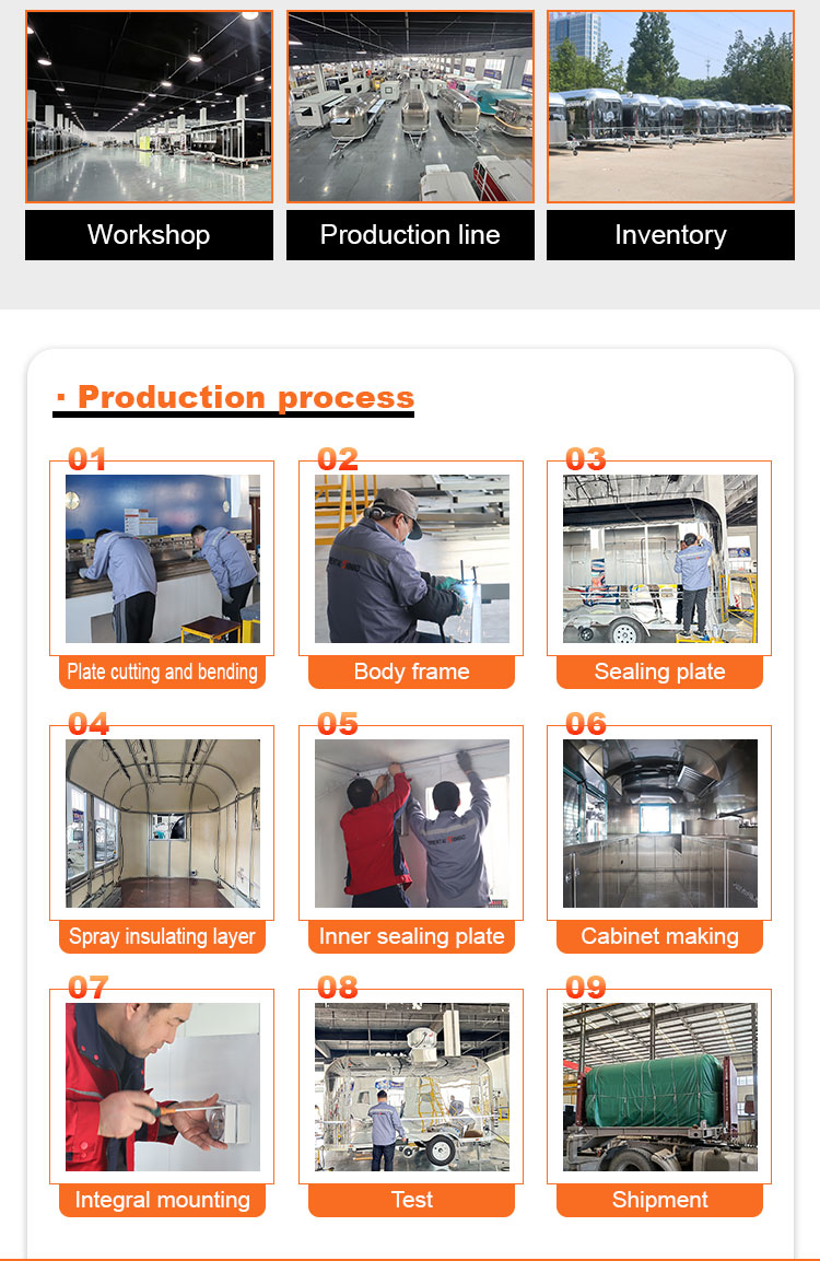 Untuk bahan utama, kami memilih keluli tahan karat 304 berkualiti tinggi, yang terkenal dengan ketahanan kakisan yang sangat baik dan ketahanan yang sangat baik, dan dapat mengekalkan prestasi yang stabil dalam pelbagai keadaan alam sekitar, memastikan produk trak makanan treler kami dapat mengekalkan kualiti dan fungsi mereka yang sangat baik walaupun dalam jangka panjang dan menghadapi pelbagai cabaran. 304 Rintangan Stainless Steel yang sangat baik terhadap kakisan, supaya trak itu tidak mudah dipengaruhi oleh pengoksidaan atau karat, yang sangat memanjangkan hayat perkhidmatannya. Rintangan kakisan yang sangat baik dari 304 keluli tahan karat menjadikan trak kurang terdedah kepada pengoksidaan atau karat, sangat memanjangkan hayat perkhidmatan mereka.
